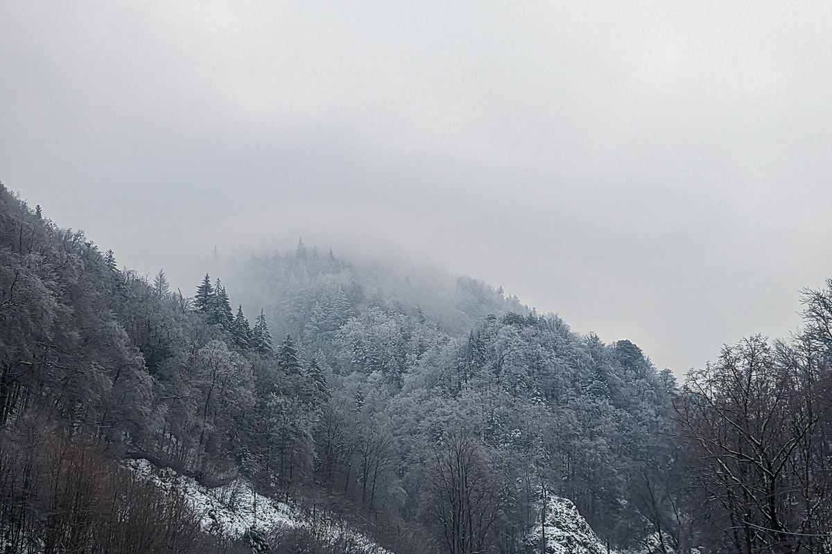 The drive was plain sailing and we made good time. There had been a reasonable amount of snowfall in the days before we arrived, and as we approached the French / German border we were greeted with picture postcard scenes of snowy topped trees and fluffy roadside blankets of snow. It was not your stereotypical crisp, clean sunny sky, but more greyscale, with low clouds clinging to the mountain tops and hillsides around us. If anything, it made the scenery all the more stunning and dramatic, and we were eager to see more and more with every passing turn and corner.