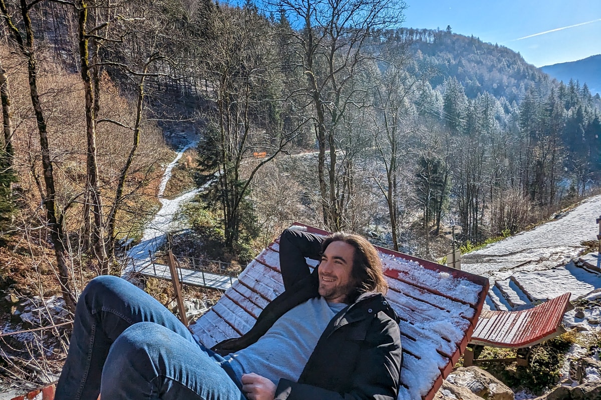 Whilst most of the snow had started to melt in places, the pathways were still quite icy, so we were only able to walk up as high as the first viewing platform. We were there nice and early and had the whole place to ourselves, which was the perfect start to our trip. From the viewing platform there's a lounger sitting below the waterfall and you can sit there and stare up at the waterfall towering above you. It's a beautiful little spot and a major sun trap on a sunny day! We've written a little bit more about the Waterfall in our post of things to do in Todtnau.