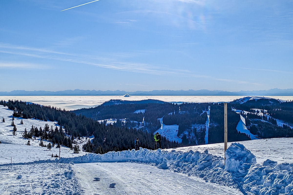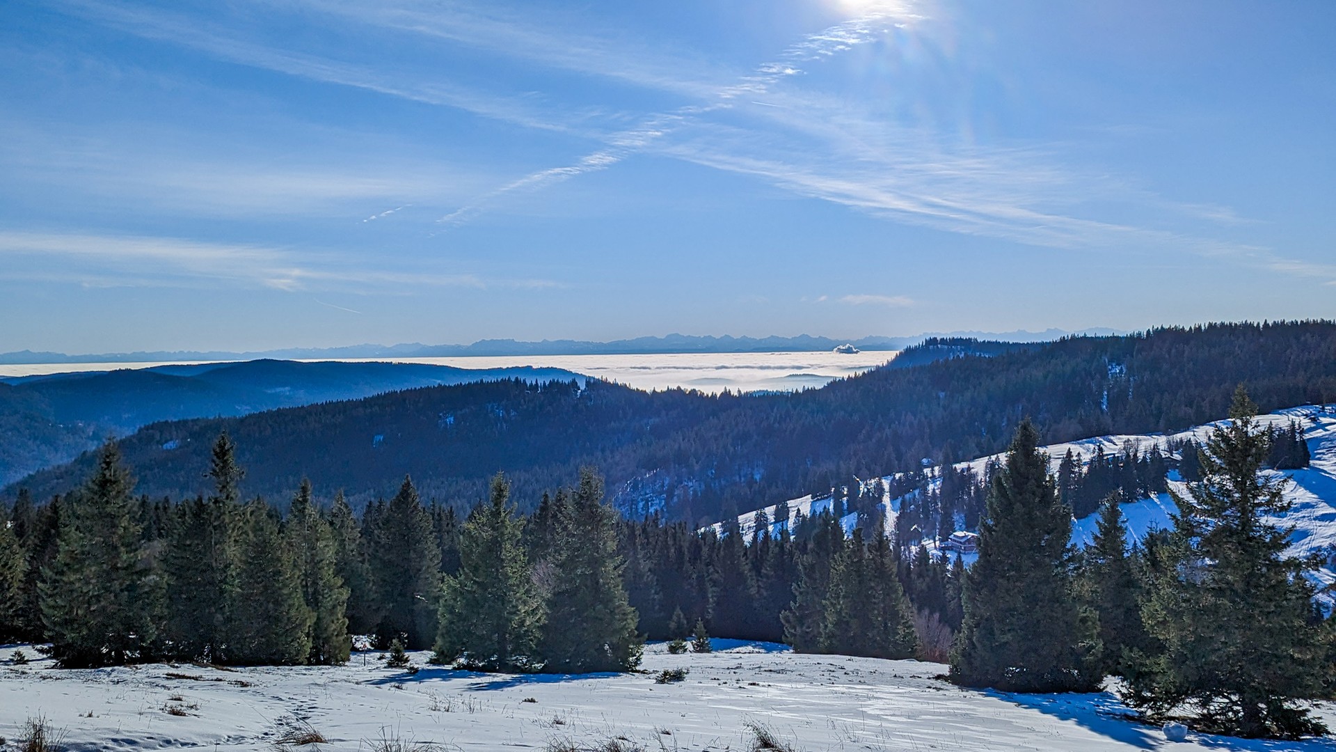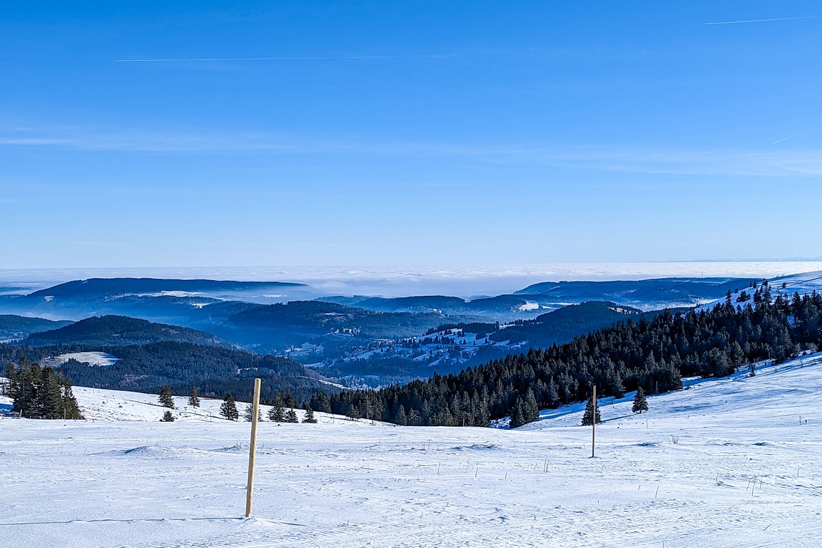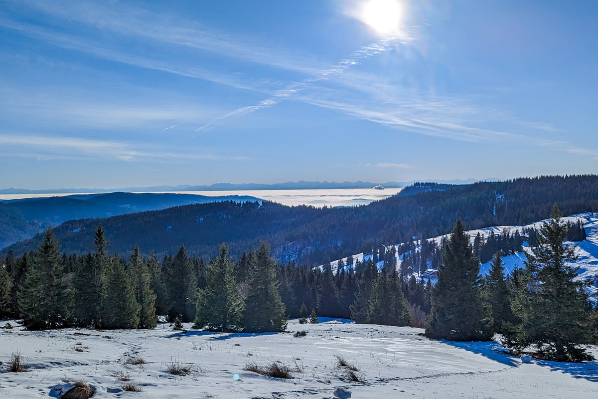 We woke up the next day to another beautiful sunny start, so we made our way to Feldberg to be big kids and play in the snow. We loved the views from the top of Feldberg in the summer when we visited last, and we knew the views would be even more spectacular in the snow, but I don't think we could have possibly imagined just how stunning the views would be. We were lucky with the weather, as the sun brought with it clear, crisp blue skies far and wide. The walk to the top of Feldberg took us twice as we continued to stop and gawp at the panoramic views around us. As we climbed higher and higher we could look out for miles across lush forests, with snow capped peaks around us, and the faint distinctive silhouette of the Alps in the distance.