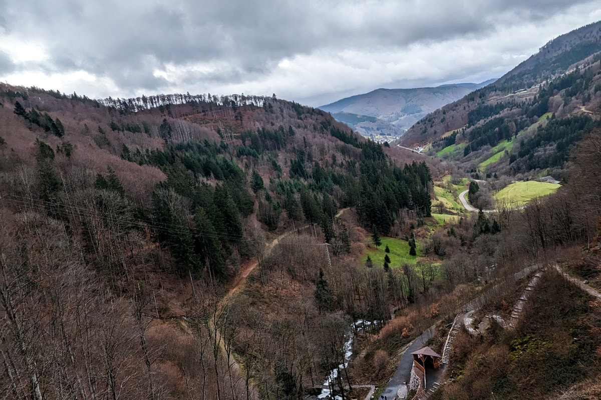 The walk lead us past the Todtnau Waterfall again, and actually thankfully due to the rain, the ice had now melted and it meant we could walk up the steps to the very top of the waterfall this time. Once at the top we were greeted with a stunning view through the valley and out to the hills far off in the distance.