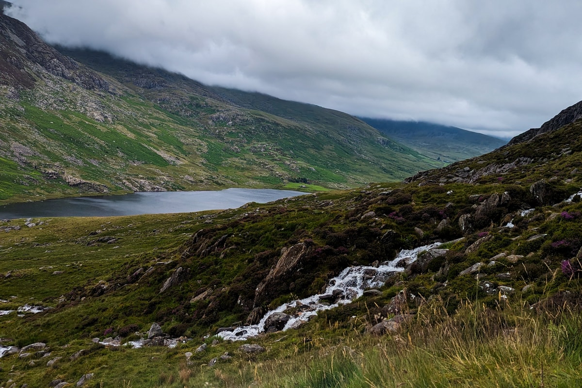 We continued our way through rolling hills and picturesque valleys, leaving Lake Ogwen lower and lower behind us. This initial park of the trek offered a relatively gentle incline, which was quite enjoyable - "I could get used to this I thought". As we gained elevation, the terrain became rockier, and although not unforgiving, required some sure footing and careful navigation. We passed many streams and a small waterfall on this first part of the ascent, covering rocky ground and some slippery rocks as we made our way across the water.
