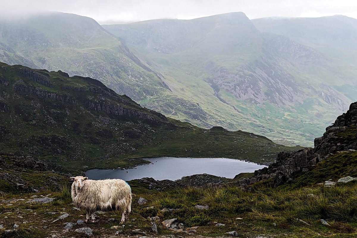 The descent felt harder than the ascent and we basically tobogganed ourselves down the slope on our bums. Similar to the way up, we could hear the sounds of a stream bubbling below us. We turned around and looked back up at where we'd come from, feeling gutted that we'd had to bail out and weren't able to reach the summit. But relishing that we'd been treated to such breath-taking vistas every step of the way and the gloomy weather made the mountain and valleys look even more dramatic and wild. Tryfan offered a unique combination of distinctive beauty, challenging terrain, stunning views, and despite not making it to the summit, still a sense of achievement.