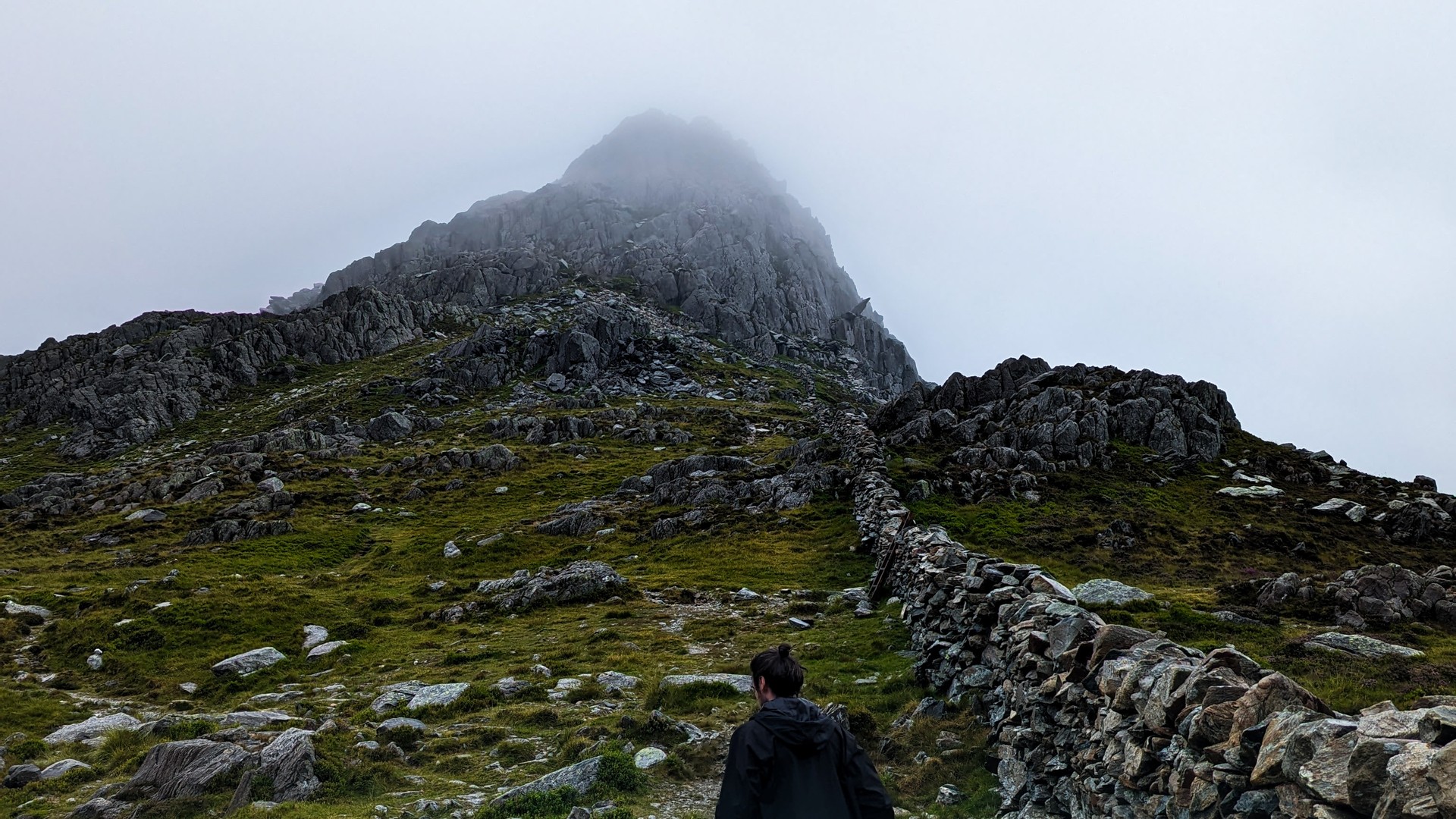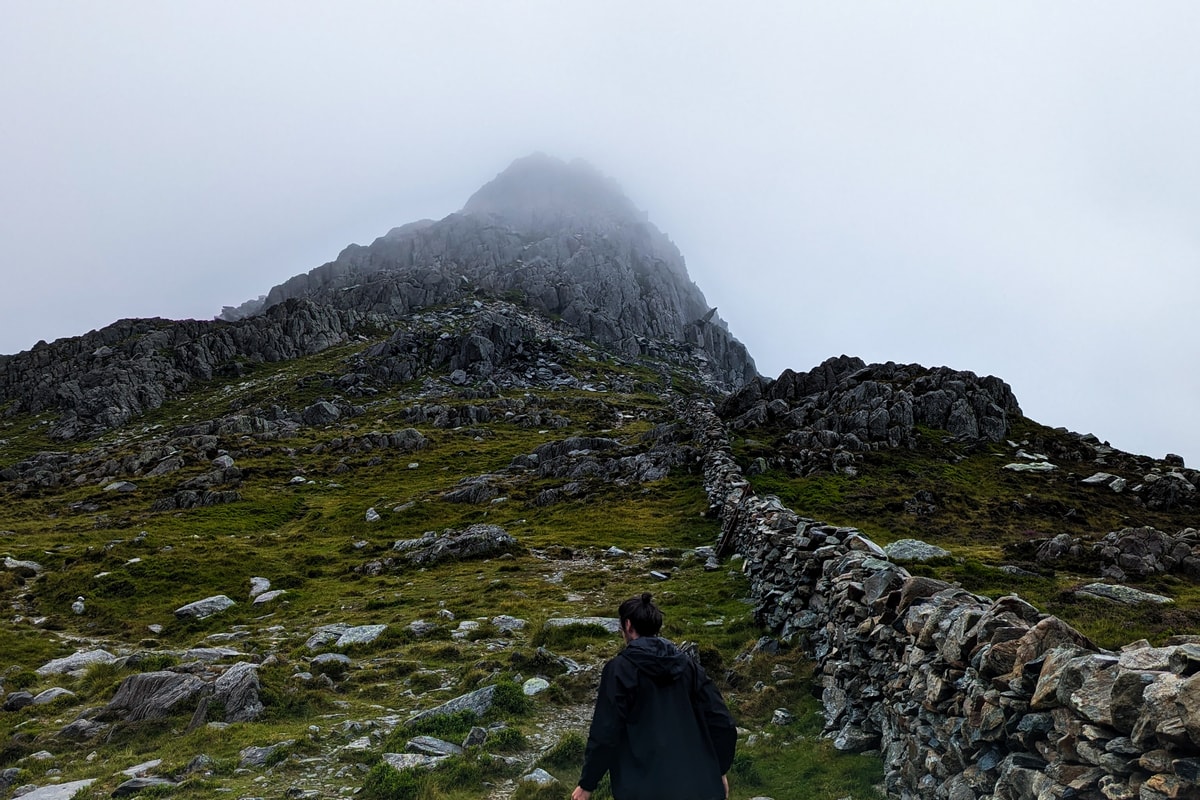 What little we did know about Tryfan, we knew there were no easy routes, with plenty of steep sections, and we knew it would be a scramble to the top, requiring all four limbs to get us there. But as we made it to the base of Tryfan, the combination of wind and poor visibility made it incredibly difficult to map out our route higher. We must have been no more than 100m away from the summit when we decided to call it quits and felt that the conditions were too risky to go on any further.