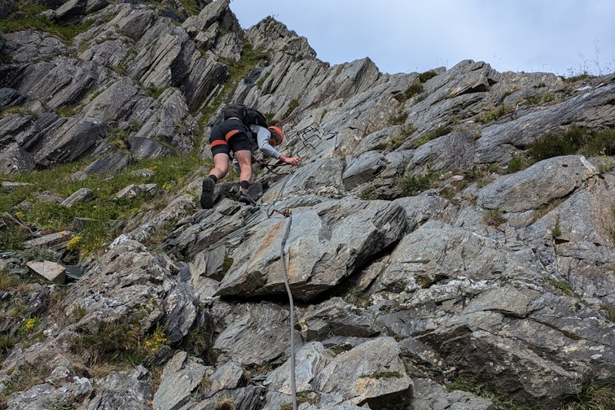 The word is Italian for "iron path". It's a climbing route made of steel cables, ladders and other fixed anchor points, helping climbers ascend vertical rock faces, narrow ledges, and exposed paths. With the assistance of a via ferrata, climbers can reach literal new heights and terrain otherwise inaccessible, unless using more technical climbing equipment. As a climber, you're secured to the steel cable with a harness and two carabiners, keeping you secure and attached to the mountainside as you move along.